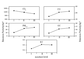 Fig. Emission factors (EFs) as a function of fuel moisture level (moisture contents are 10%, 28% and 50% of dry fuel mass for level I, II and III, respectively) |